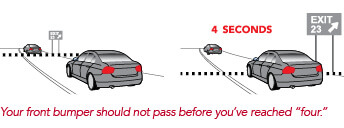 Have your teen practice the four-second rule at least 10–12 times, counting out loud to check whether their following distance is appropriate.
