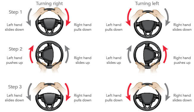 - Use smooth, continuous steering wheel movements when approaching a turn and when returning (sliding) the wheel through the hands until the vehicle is in the proper post-turn position.